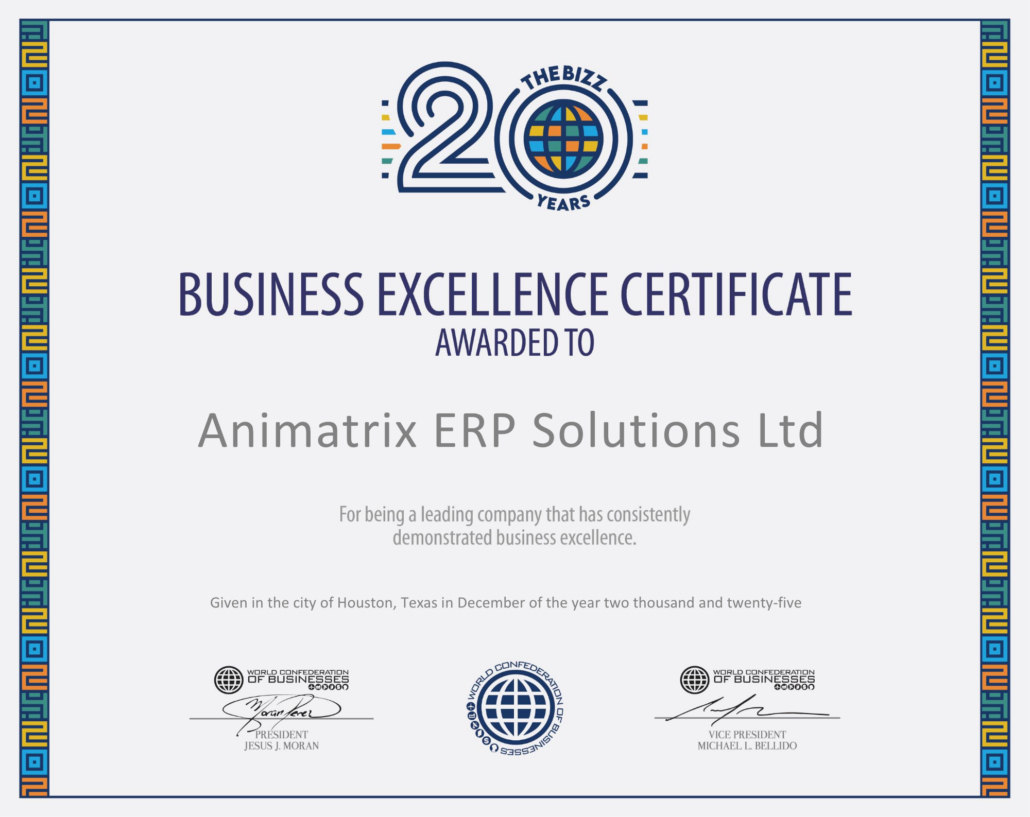 Animatrix ERP Solutions Ltd is proud to be awarded the Business Excellence Certificate in recognition of our consistent commitment to delivering outstanding solutions and demonstrating excellence in business practices.
